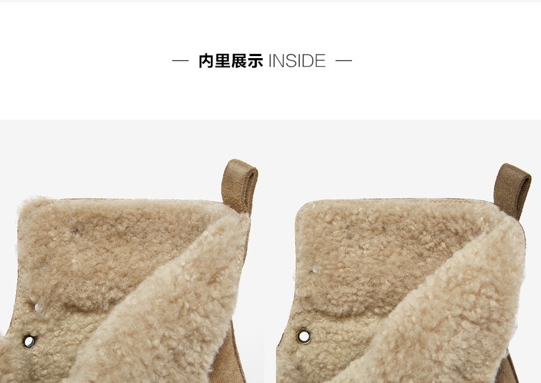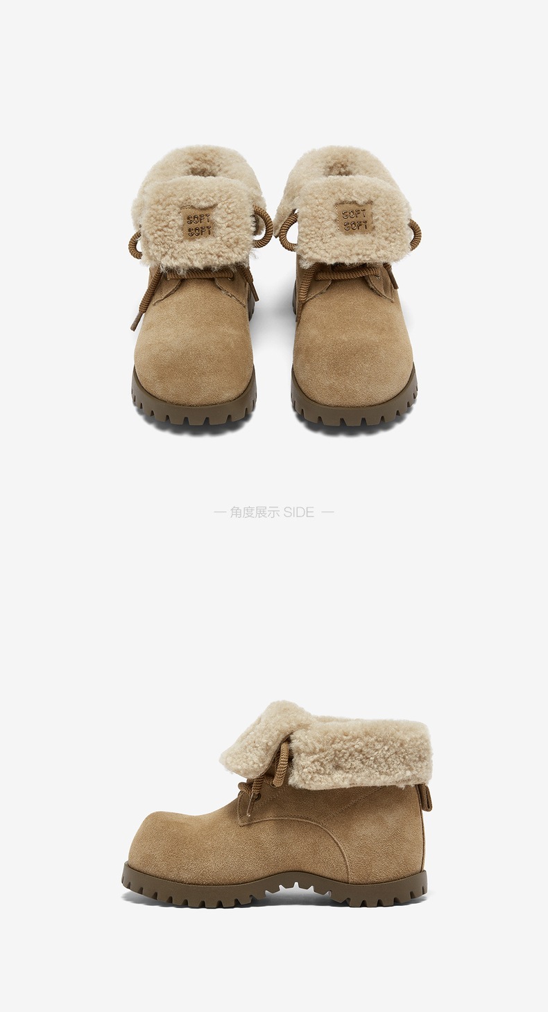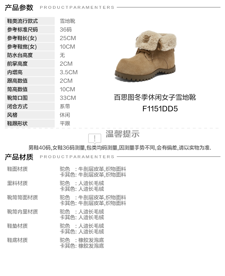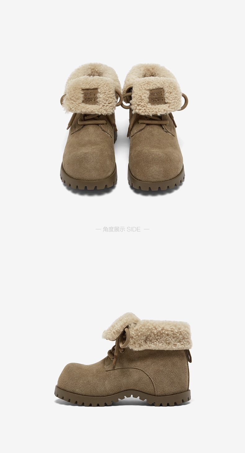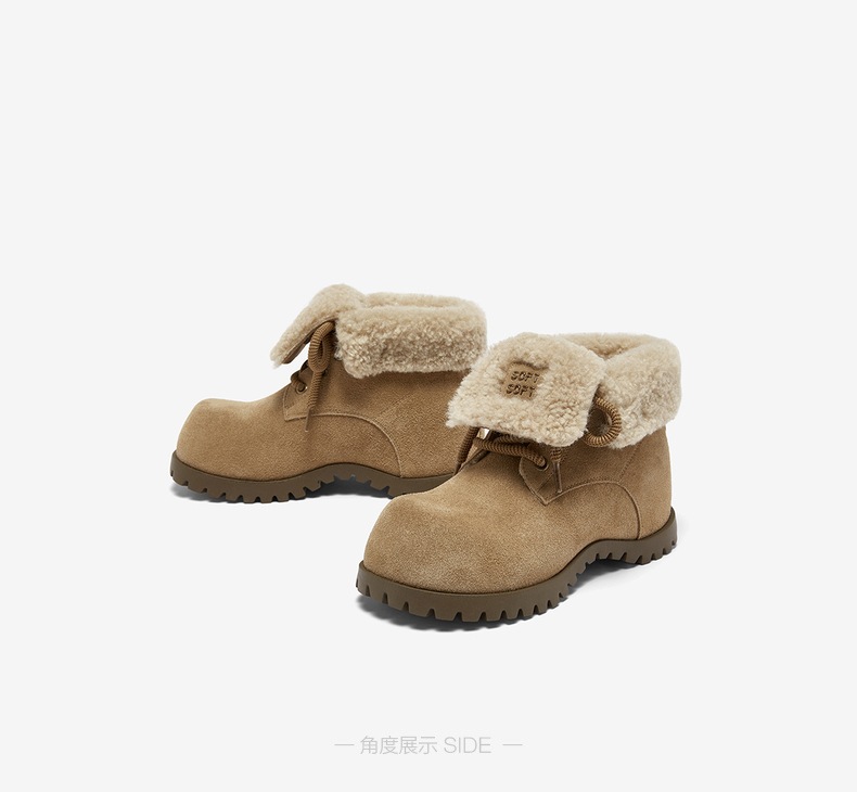 | 帮面材质:织物牛剖层革 | 配跟:无 | 靴筒口围:33CM | 上市时间:2025年冬季 | 鞋类流行款式:雪地靴 |