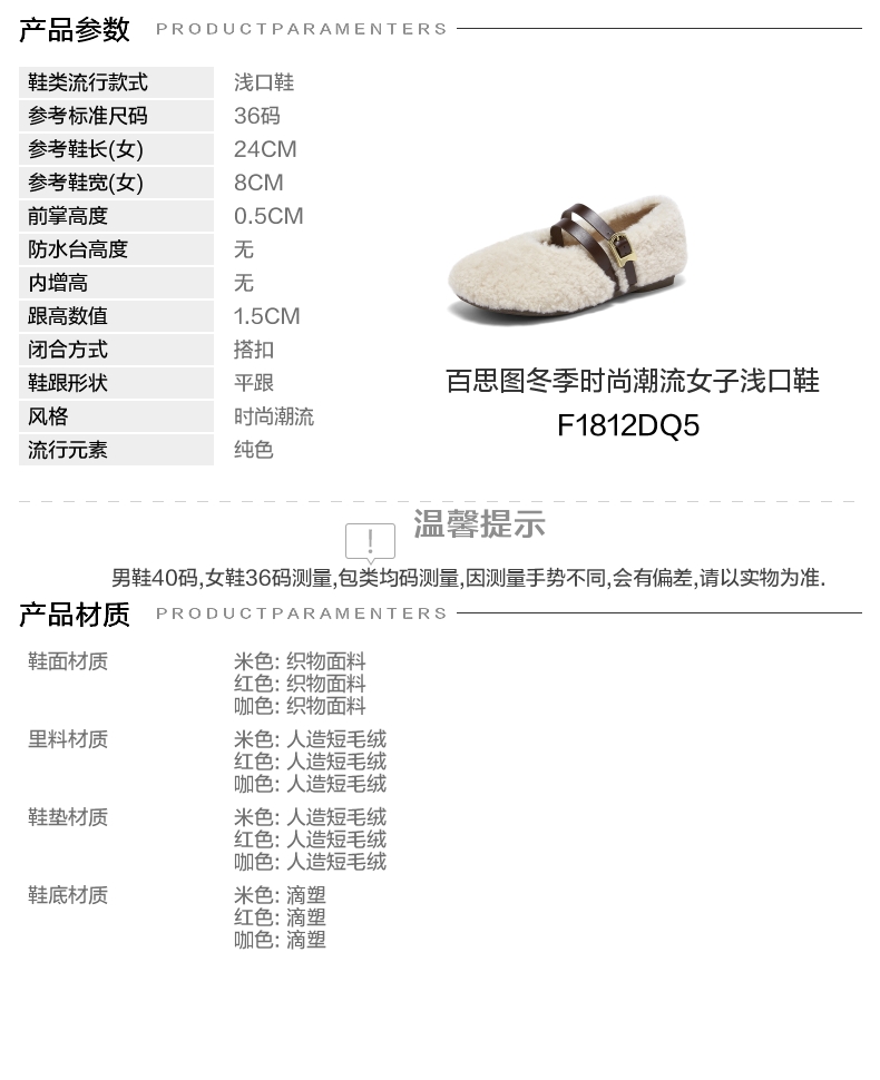 | 参考鞋长(女):24CM | 流行元素:纯色 | 参考鞋宽(女):8CM | 风格:时尚潮流 | 鞋面内里材质:人造短毛绒 |