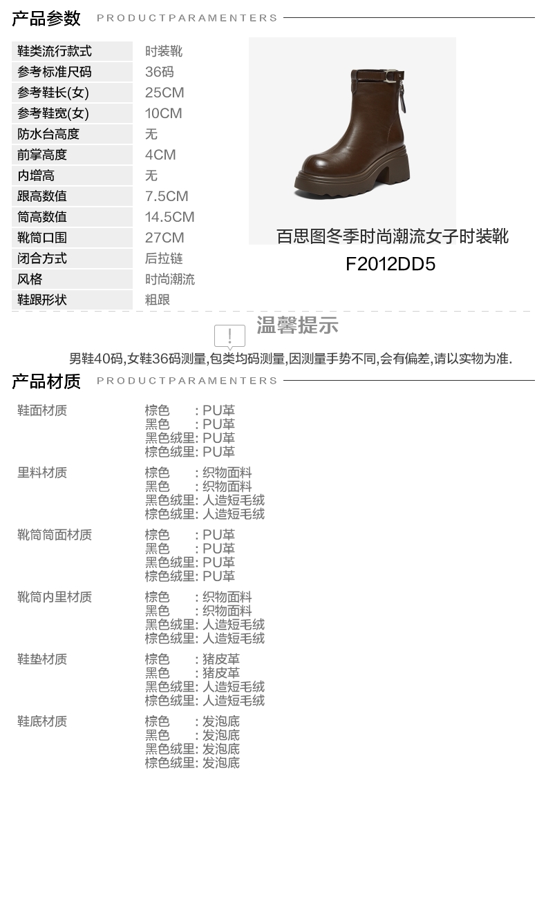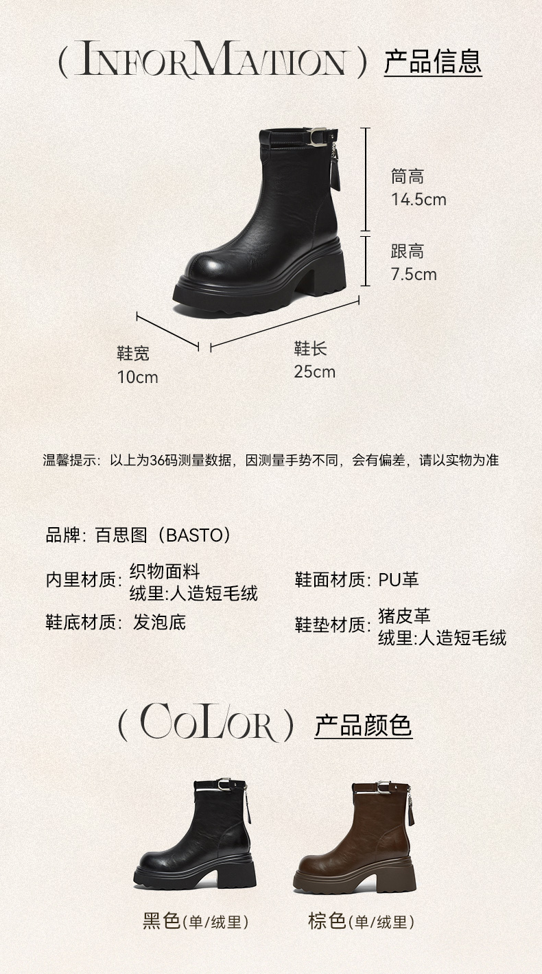 | 款式季节:冬季 | 前掌高度:4CM | 皮质特征:PU | 防水台高度:无 |