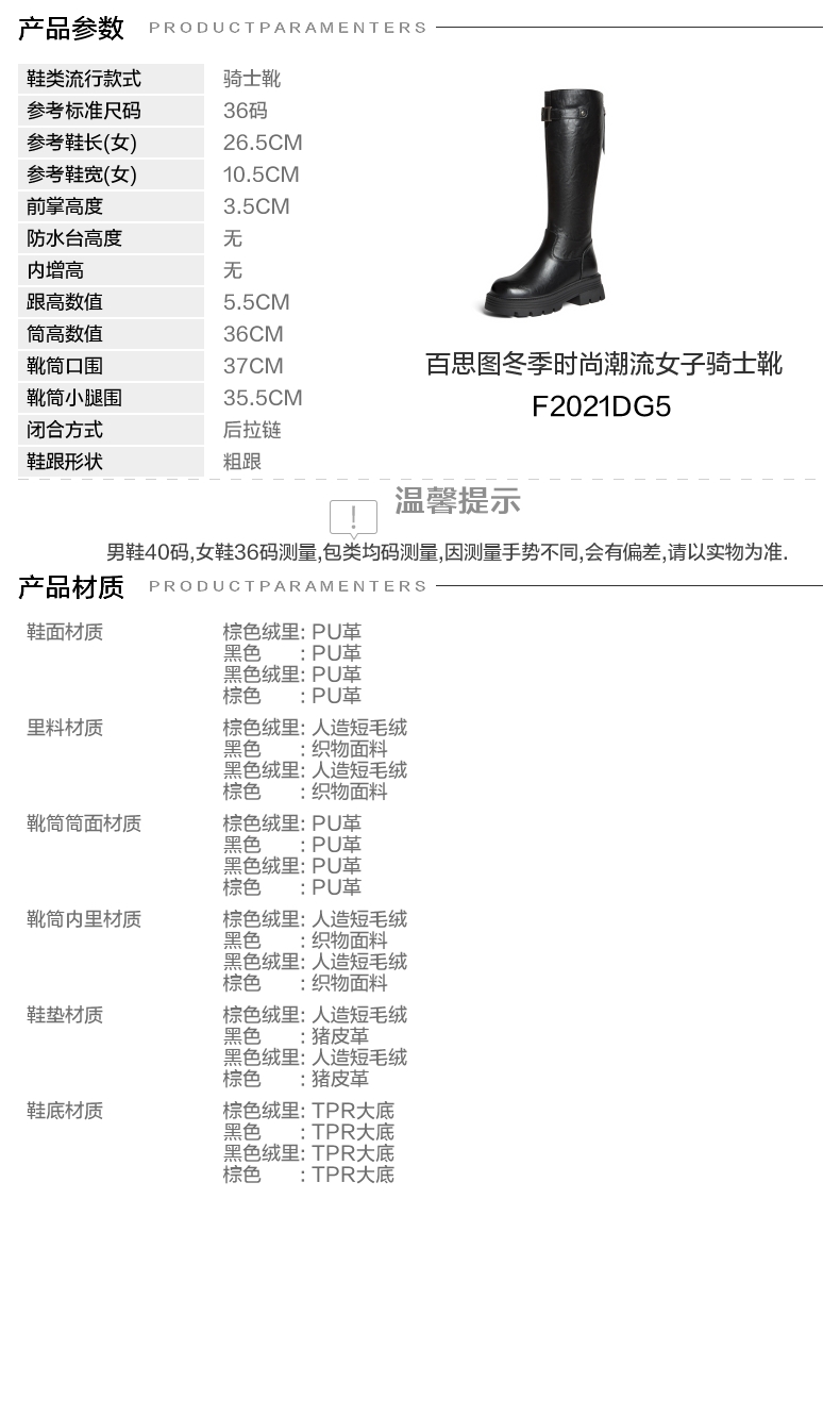| 靴筒筒面材质:PU革 | 靴筒小腿围:35.5CM | 里料材质:人造短毛绒 | 制鞋工艺:胶贴皮鞋 | 鞋垫材质:人造短毛绒 |