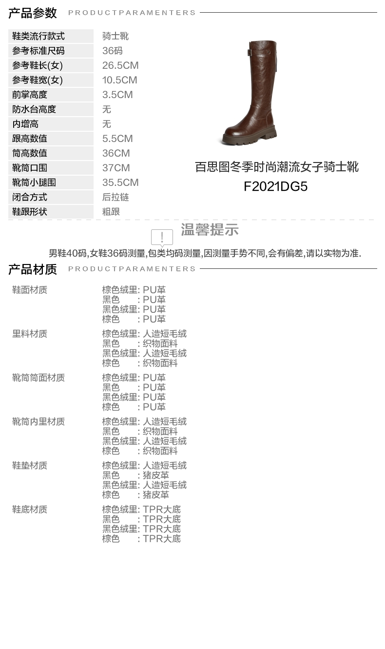 | 风格:时尚潮流 | 色系:棕色 | 跟高数值:5.5CM | 性别:女子 | 筒高数值:36CM |