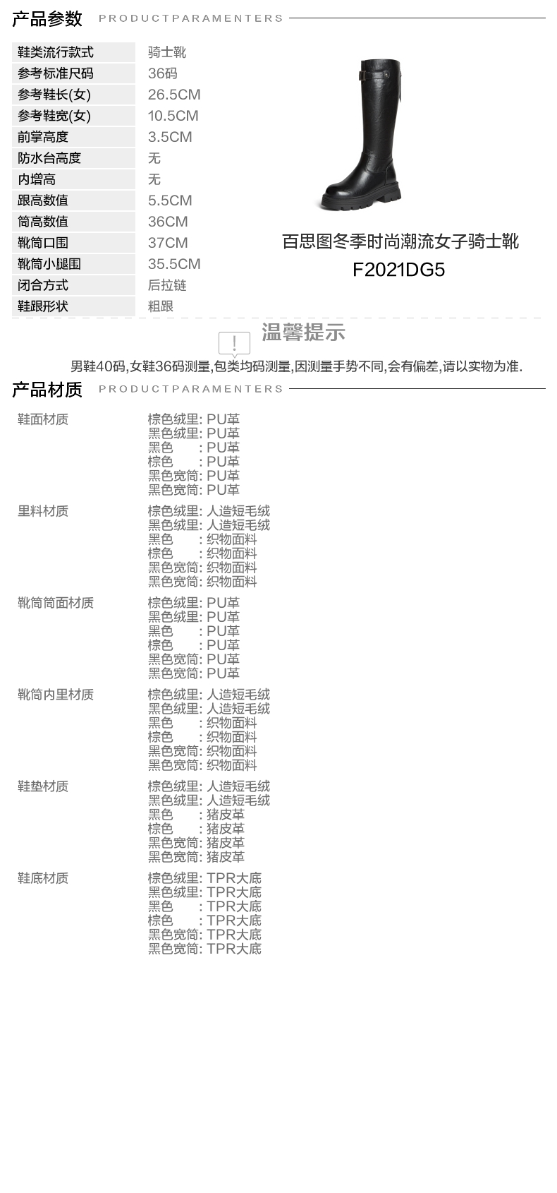 | 靴筒筒面材质:PU革 | 靴筒小腿围:35.5CM | 里料材质:织物面料 | 制鞋工艺:胶贴皮鞋 | 鞋垫材质:猪皮革 |