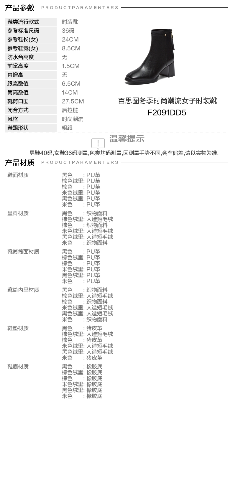 | 鞋底材质:橡胶底 | 靴筒内里材质:人造短毛绒 | 内增高:无 | 鞋面材质:PU革 | 闭合方式:后拉链 |