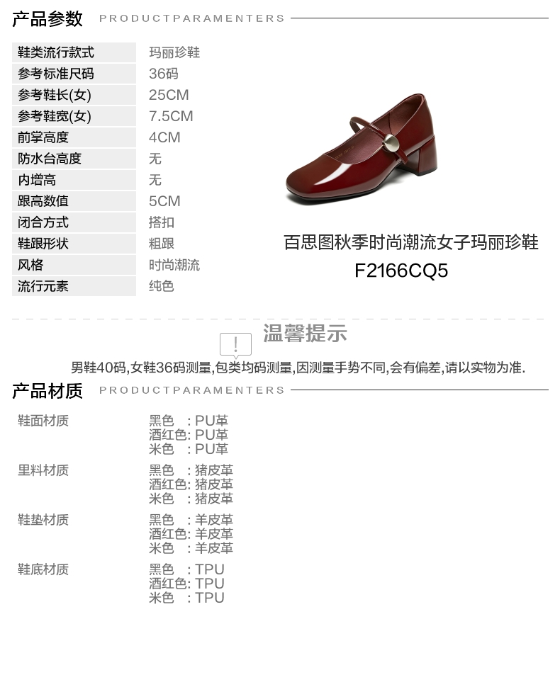 | 皮质特征:PU | 前掌高度:4CM | 防水台高度:无 | 鞋类流行款式:玛丽珍鞋 |