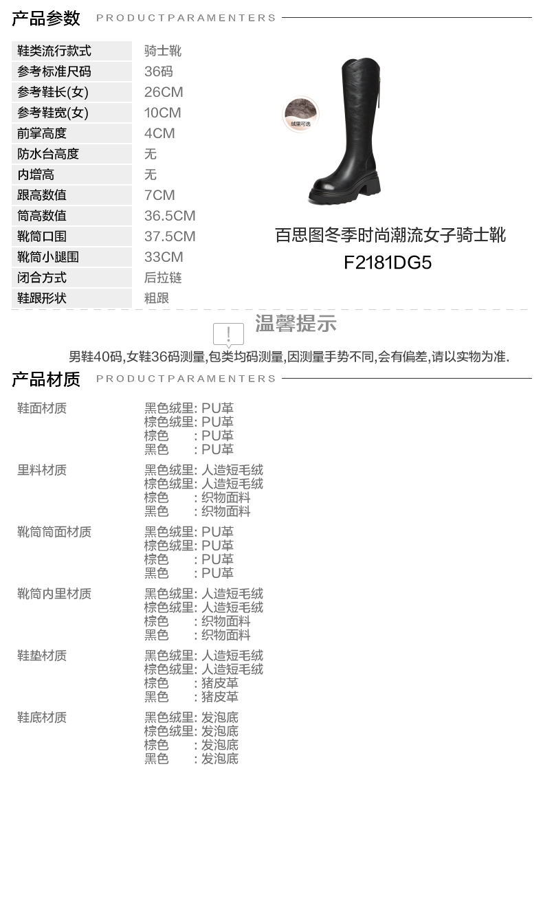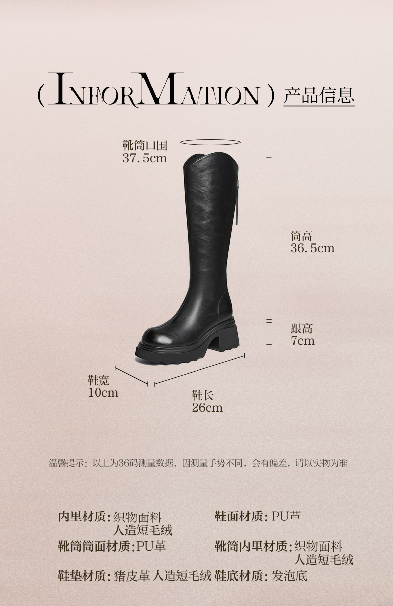 | 风格:时尚潮流 | 色系:黑色 | 跟高数值:7CM | 性别:女子 | 筒高数值:36.5CM |