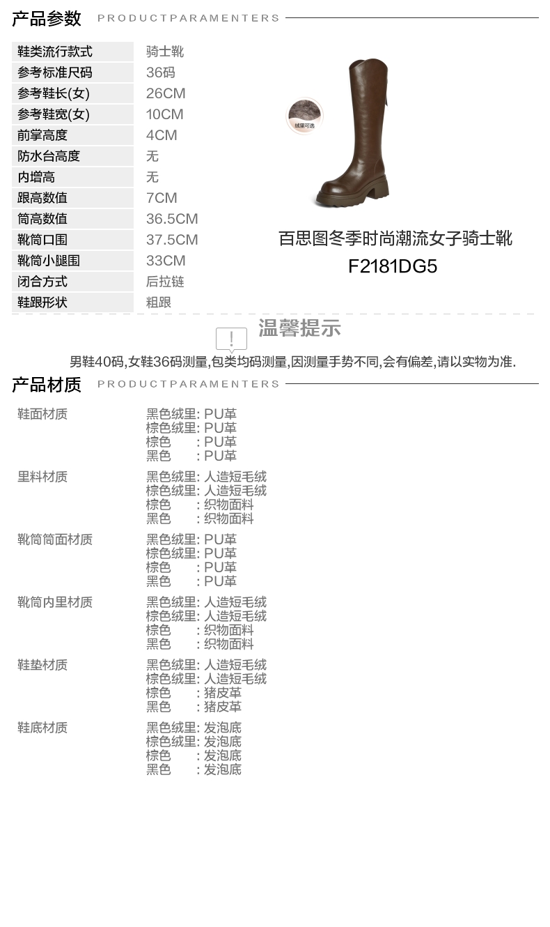 | 风格:时尚潮流 | 色系:棕色 | 跟高数值:7CM | 性别:女子 | 筒高数值:36.5CM |