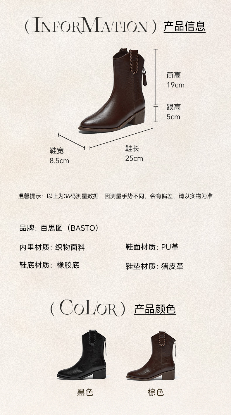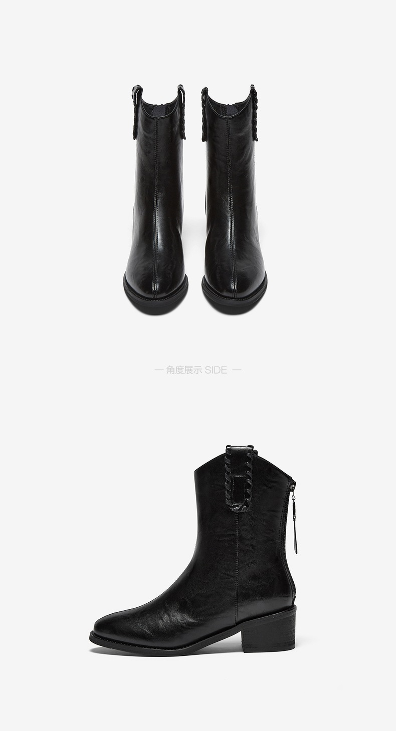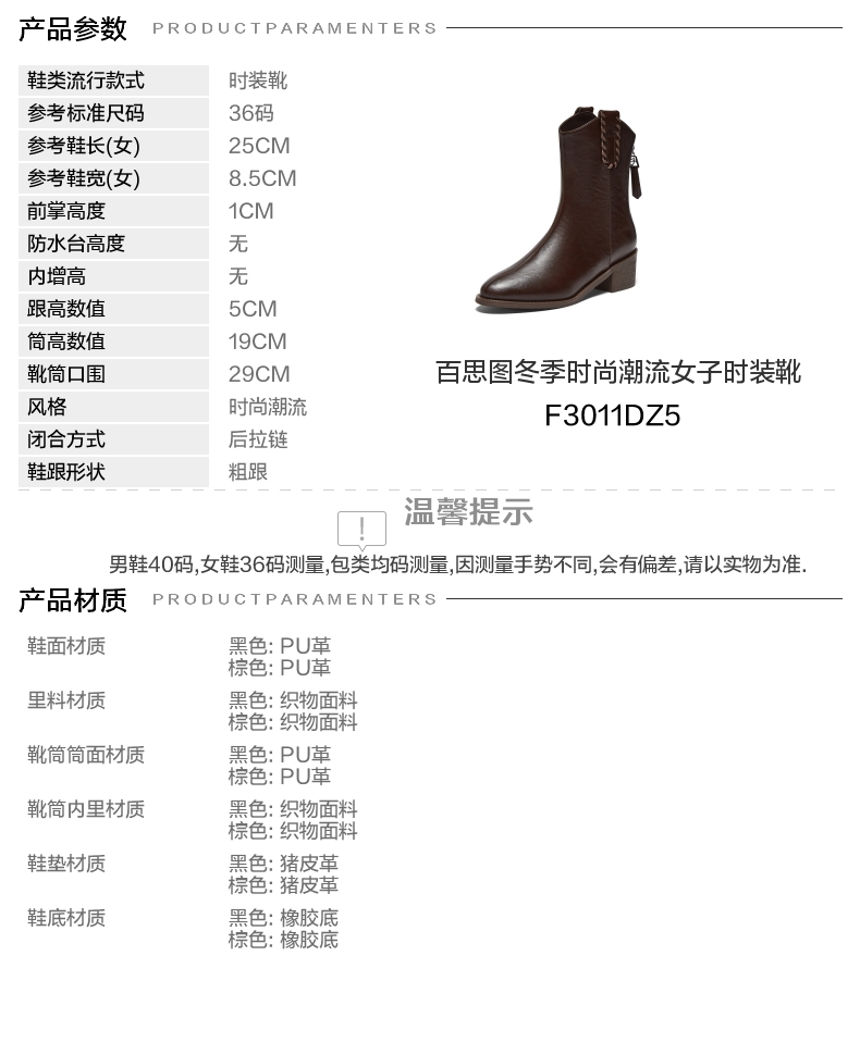 | 鞋底材质:橡胶底 | 靴筒内里材质:织物面料 | 内增高:无 | 鞋面材质:PU革 | 闭合方式:后拉链 |