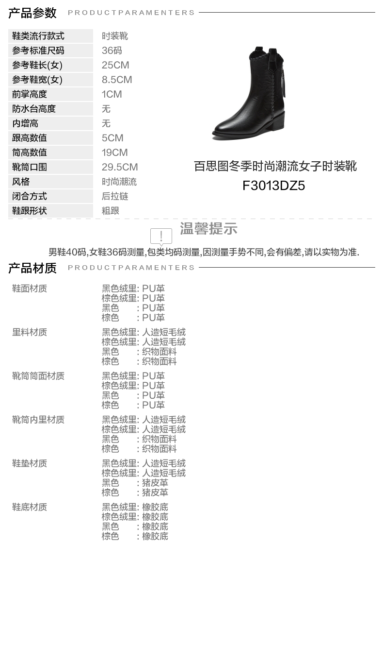 | 鞋底材质:橡胶底 | 靴筒内里材质:人造短毛绒 | 内增高:无 | 鞋面材质:PU革 | 闭合方式:后拉链 |