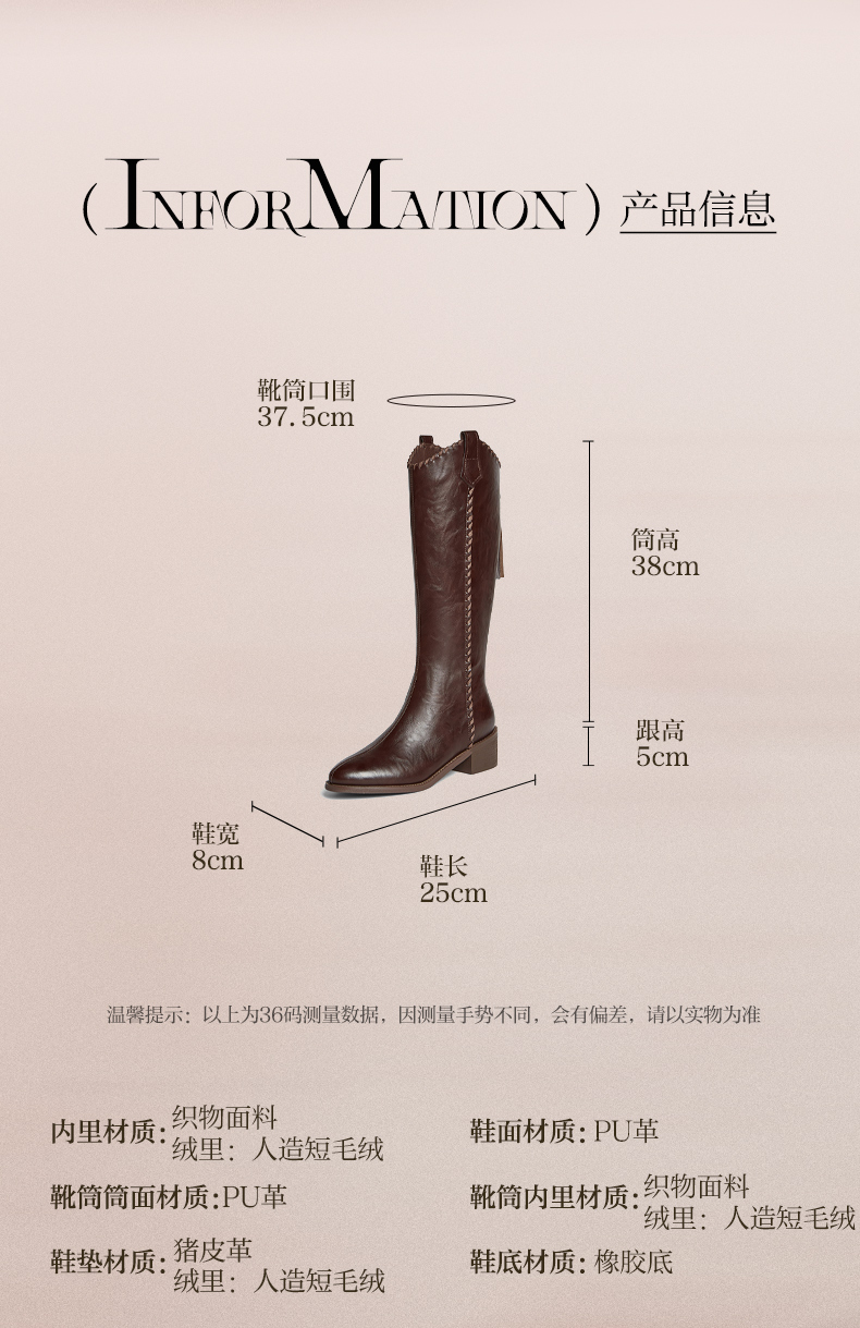 | 配跟:无 | 靴筒口围:37.5CM | 上市时间:2025年冬季 | 鞋类流行款式:骑士靴 | 鞋头款式:尖头 |