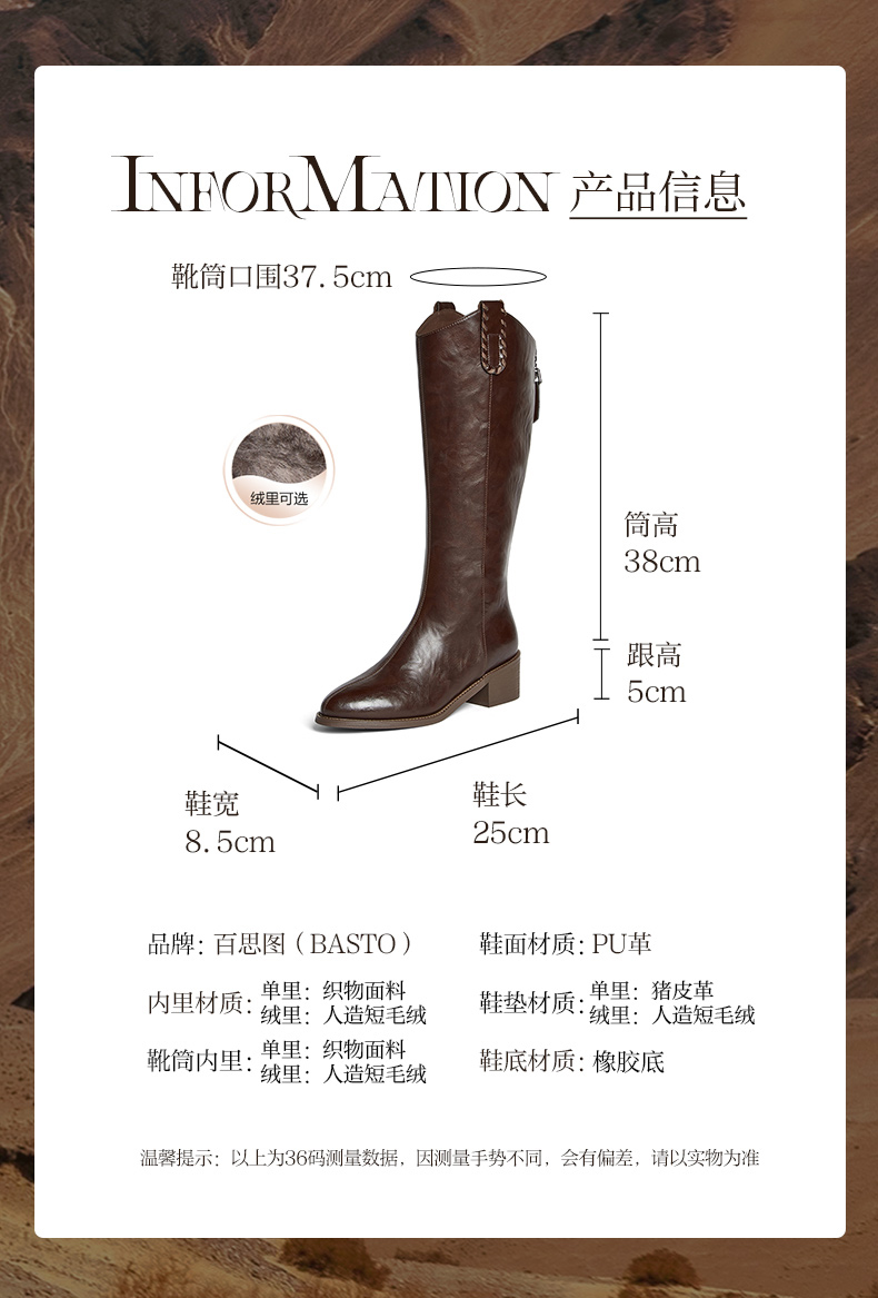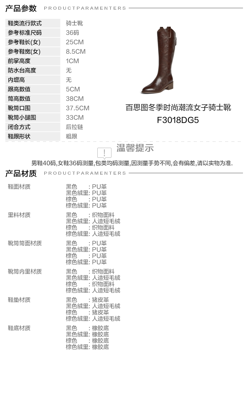 | 靴筒筒面材质:PU革 | 靴筒小腿围:33CM | 里料材质:人造短毛绒 | 制鞋工艺:胶贴皮鞋 | 鞋垫材质:人造短毛绒 |