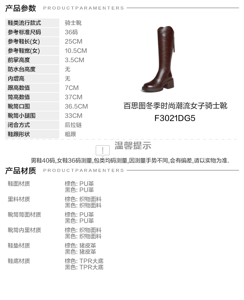 | 风格:时尚潮流 | 色系:棕色 | 跟高数值:7CM | 性别:女子 | 筒高数值:37CM |