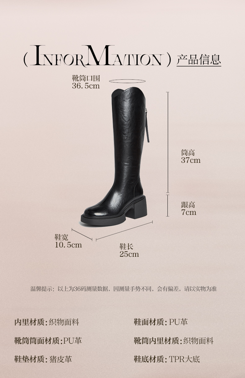 | 配跟:无 | 靴筒口围:36.5CM | 上市时间:2025年冬季 | 鞋类流行款式:骑士靴 | 鞋头款式:圆头 |