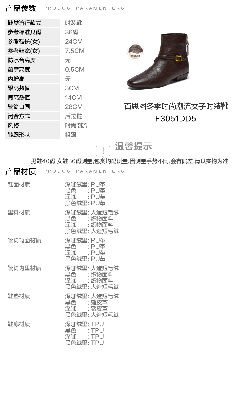 | 鞋底材质:TPU | 靴筒内里材质:人造短毛绒 | 内增高:无 | 鞋面材质:PU革 | 闭合方式:后拉链 |