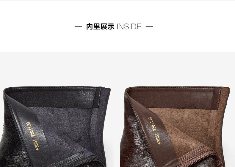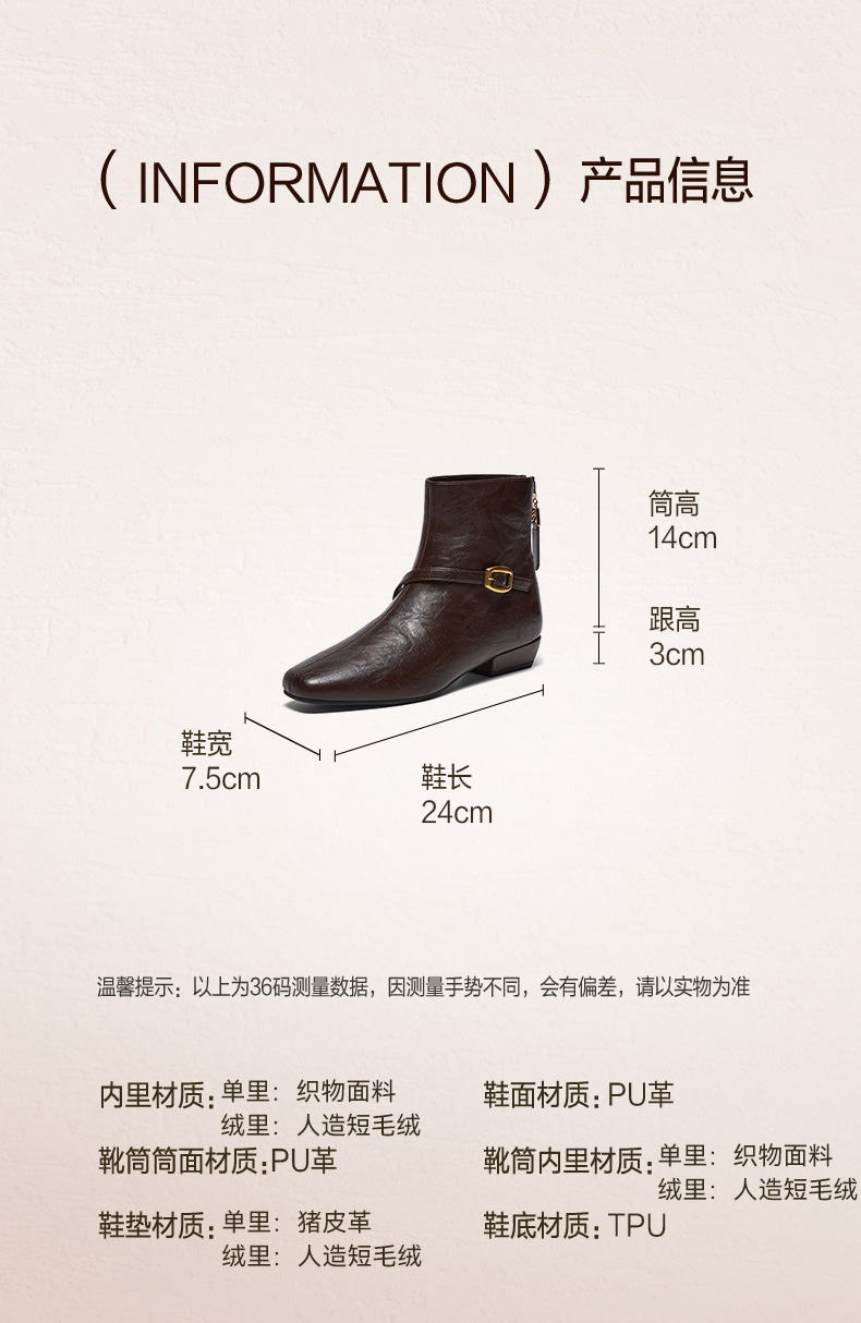 | 鞋底材质:TPU | 靴筒内里材质:人造短毛绒 | 内增高:无 | 鞋面材质:PU革 | 闭合方式:后拉链 |