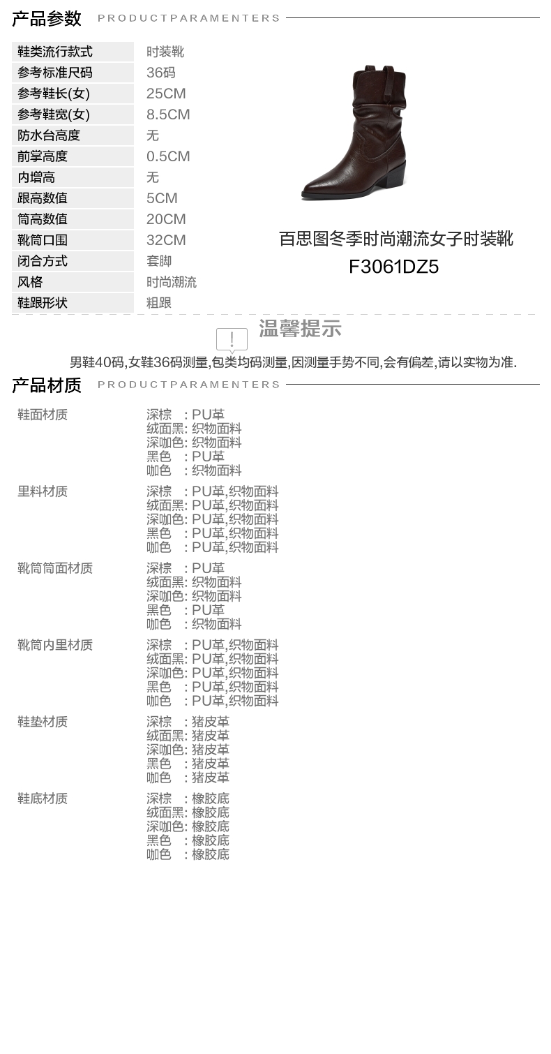 | 参考鞋宽(女):8.5CM | 风格:时尚潮流 | 色系:棕色 | 跟高数值:5CM | 筒高数值:20CM |