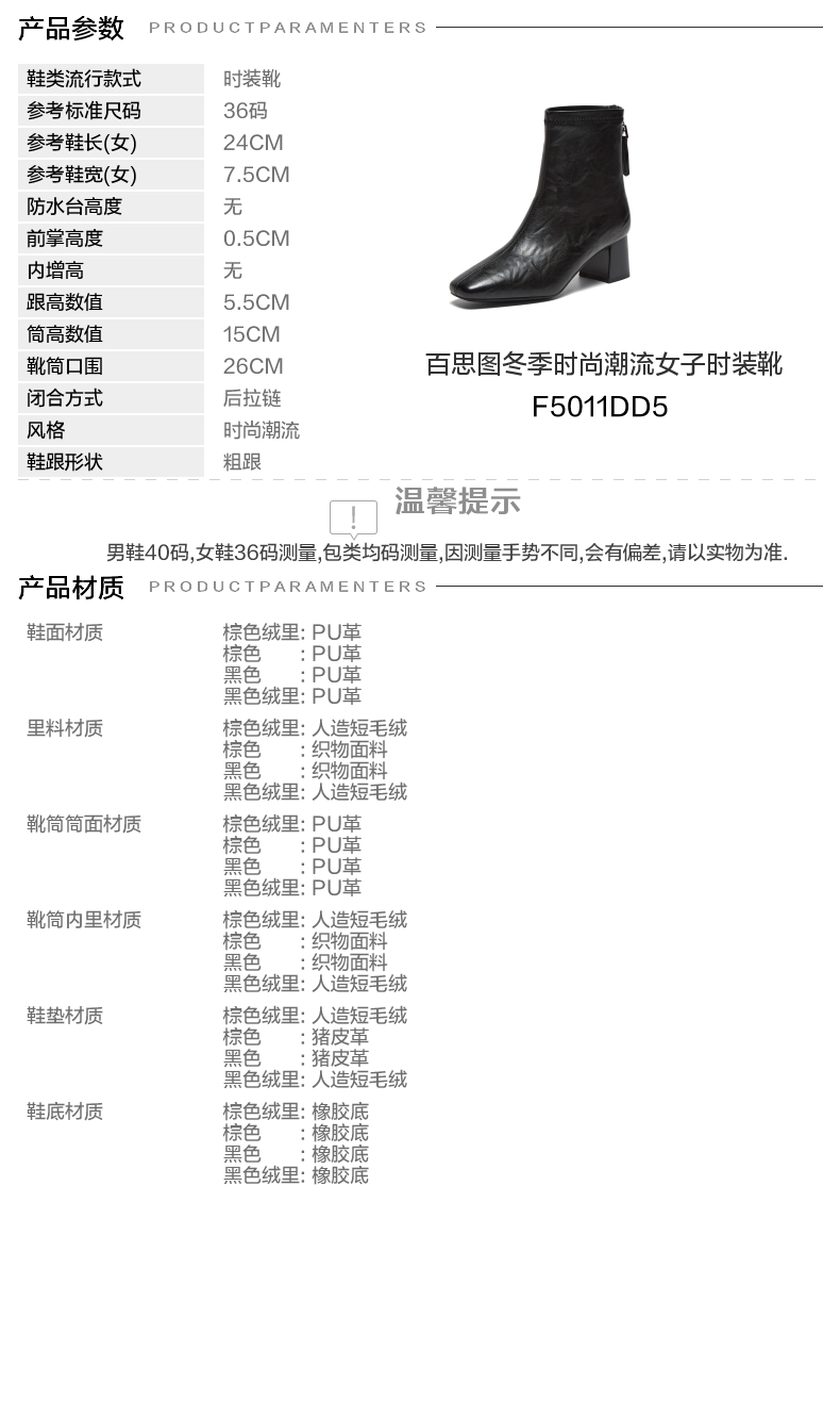 | 鞋底材质:橡胶底 | 靴筒内里材质:织物面料 | 内增高:无 | 鞋面材质:PU革 | 闭合方式:后拉链 |