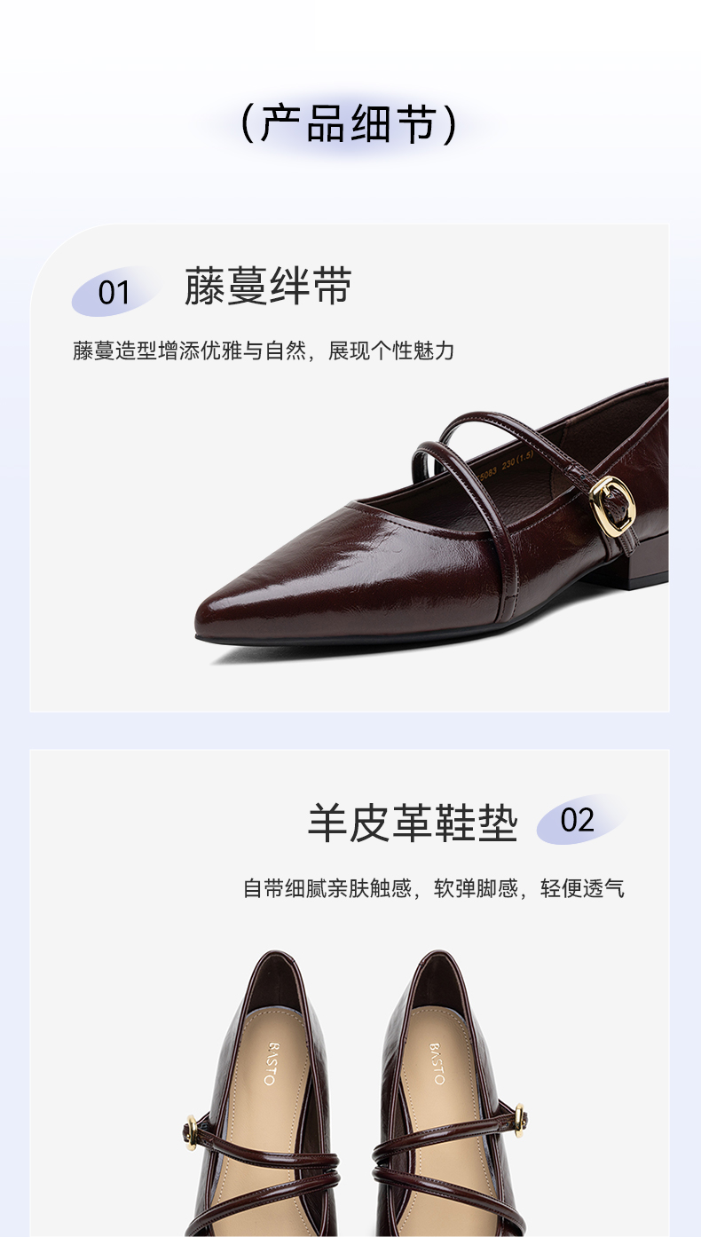 BASTO(百思图),品牌拥有17年历史,秉承优雅、甜美、清新的设计理念,主张“好嫁风”的产品风格,将甜美俏丽的少女情怀融合优雅气质的时尚品味,塑造出唯美优雅、受欢迎的女鞋款式。主打以女性温柔与亲和力为特色的流行时尚产品,糅合雅致又富有亲和力的裸粉色调,淑媛端庄、清新甜美。目前品牌已开设线下门店达1400多家。