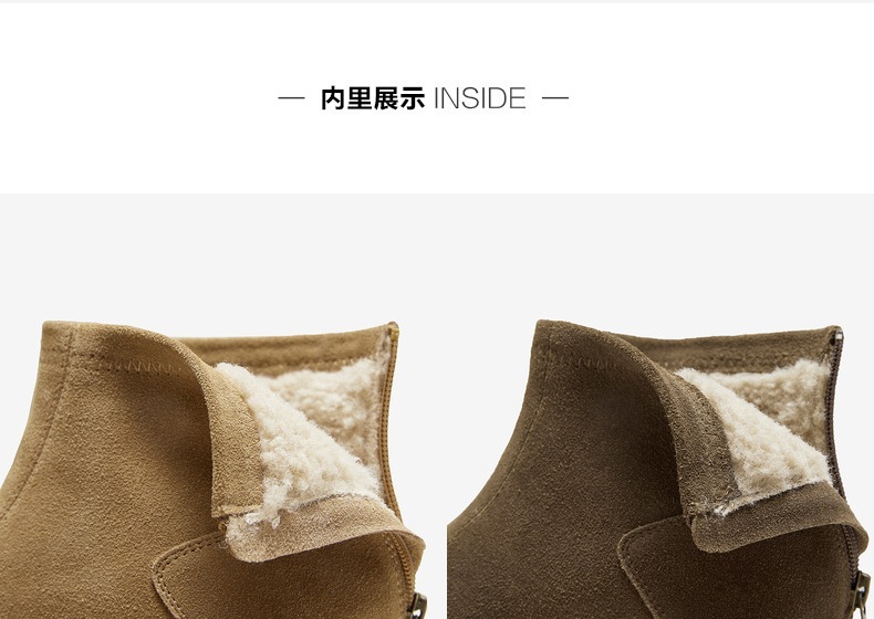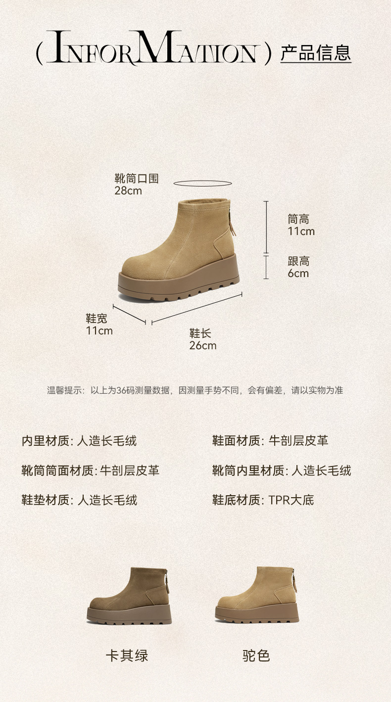 | 鞋底材质:TPR大底 | 靴筒内里材质:人造长毛绒 | 内增高:无 | 鞋面材质:牛剖层皮革 | 闭合方式:后拉链 |