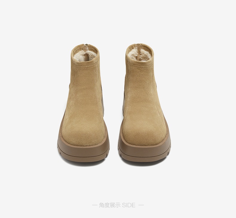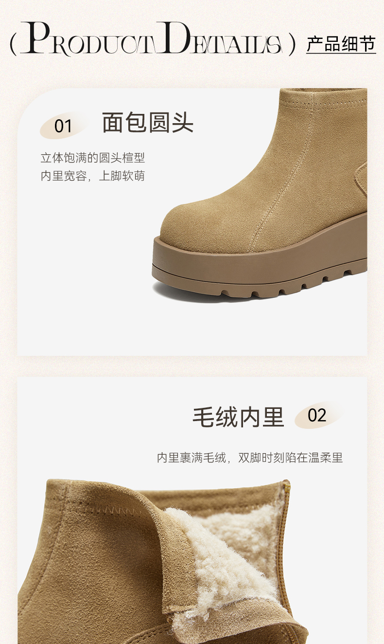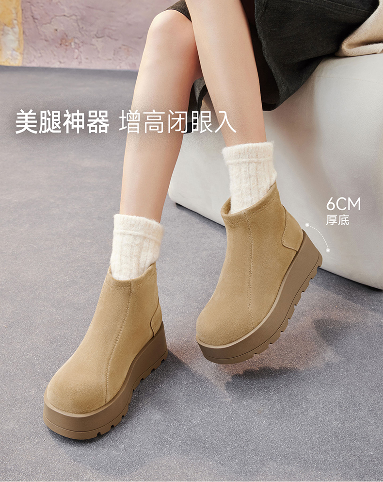 | 帮面材质:牛二层皮 | 配跟:无 | 靴筒口围:28CM | 上市时间:2025年冬季 | 鞋类流行款式:雪地靴 |