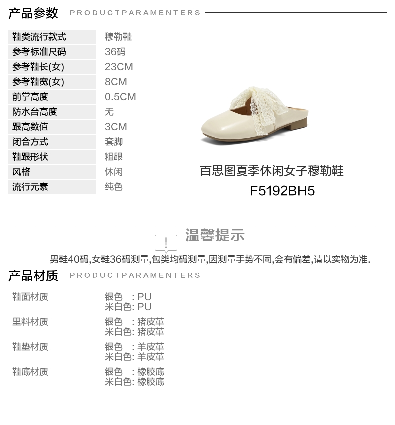 | 鞋类流行款式:穆勒鞋 | 鞋头款式:方头 | 执行标准:Q/LR001-2023 | 跟高范围:中跟鞋(3-5CM) | 鞋面图案:纯色 |