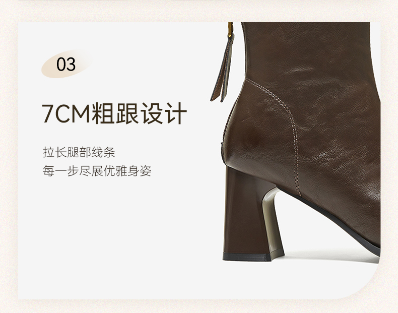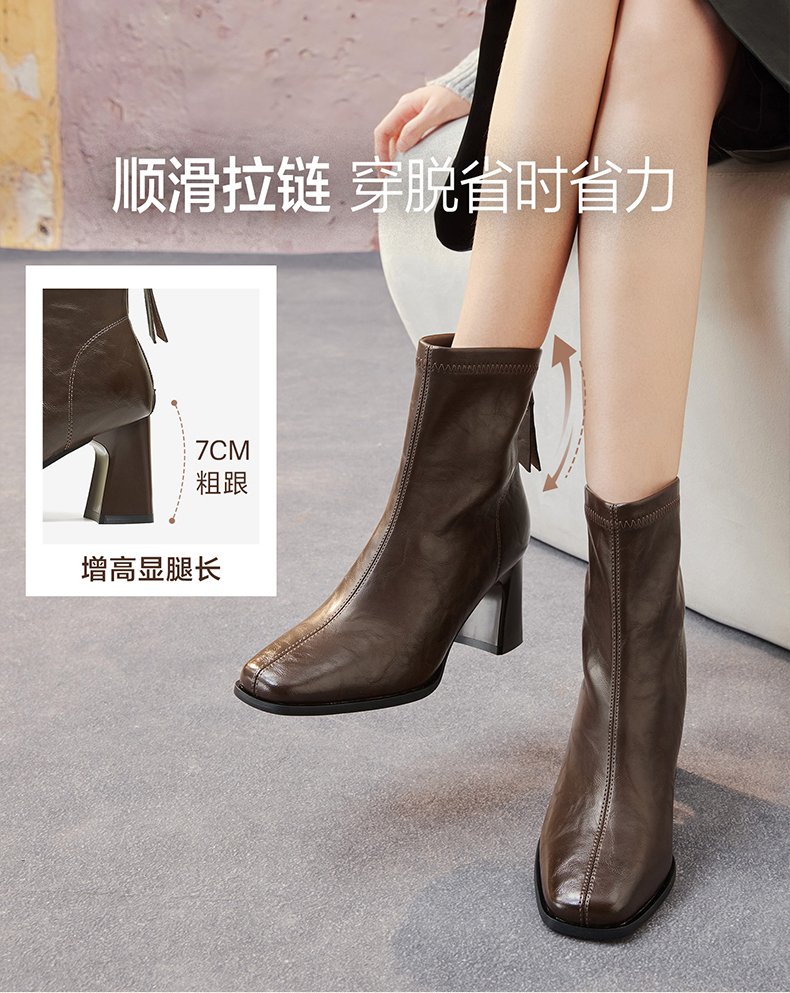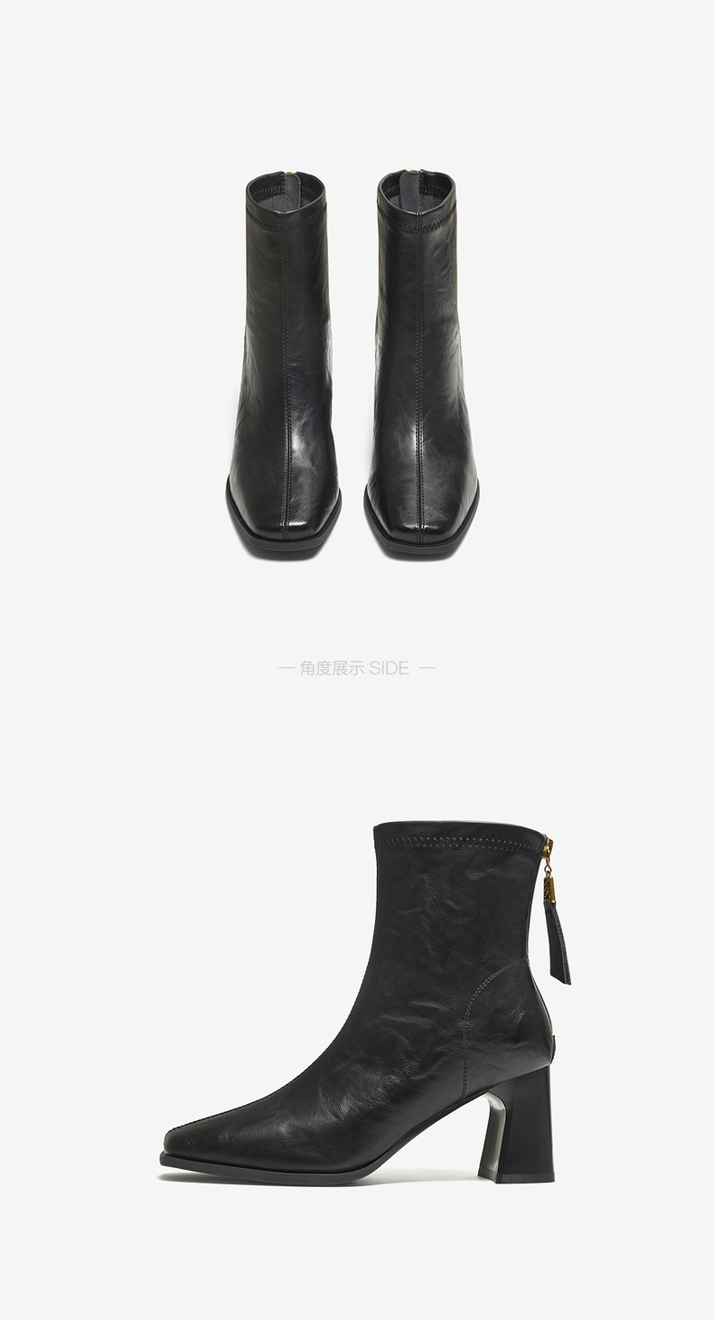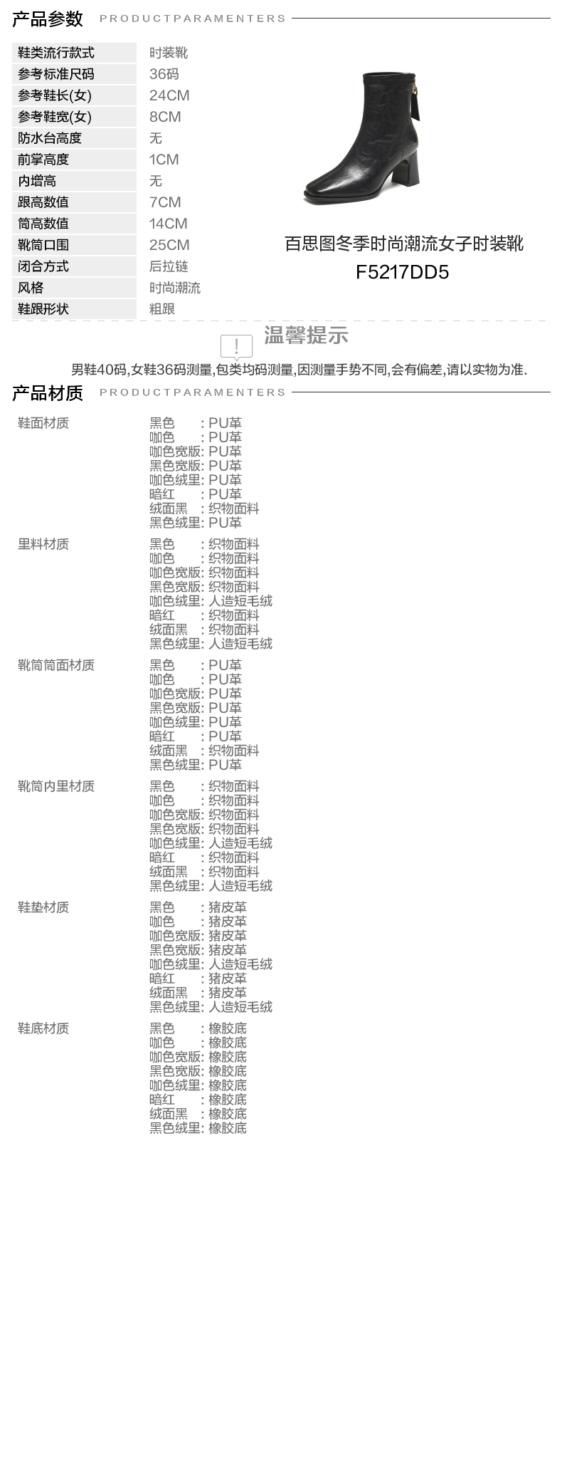 | 鞋底材质:橡胶底 | 靴筒内里材质:织物面料 | 内增高:无 | 鞋面材质:PU革 | 闭合方式:后拉链 |