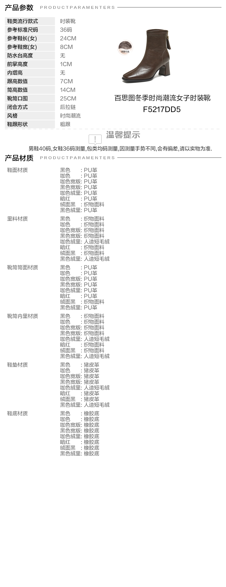 | 参考鞋宽(女):8CM | 风格:时尚潮流 | 色系:棕色 | 跟高数值:7CM | 筒高数值:14CM |