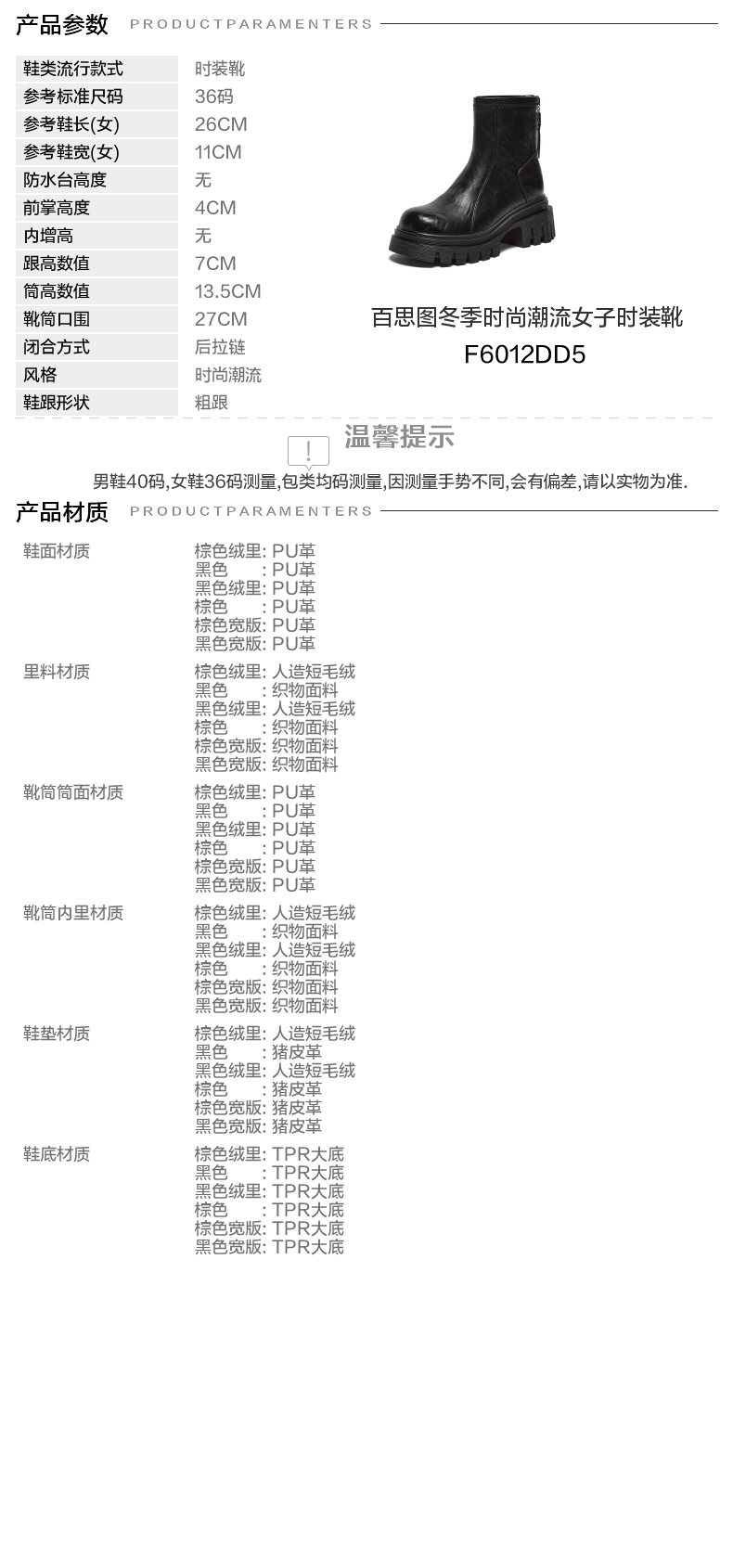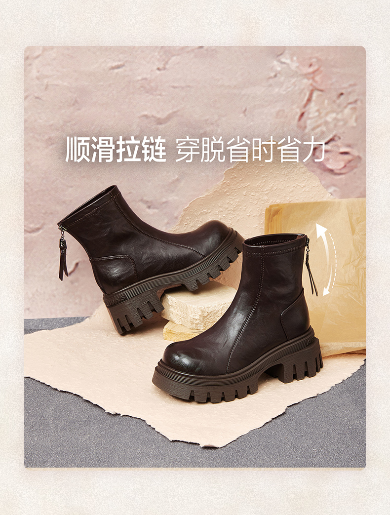 | 鞋底材质:TPR大底 | 靴筒内里材质:织物面料 | 内增高:无 | 鞋面材质:PU革 | 闭合方式:后拉链 |