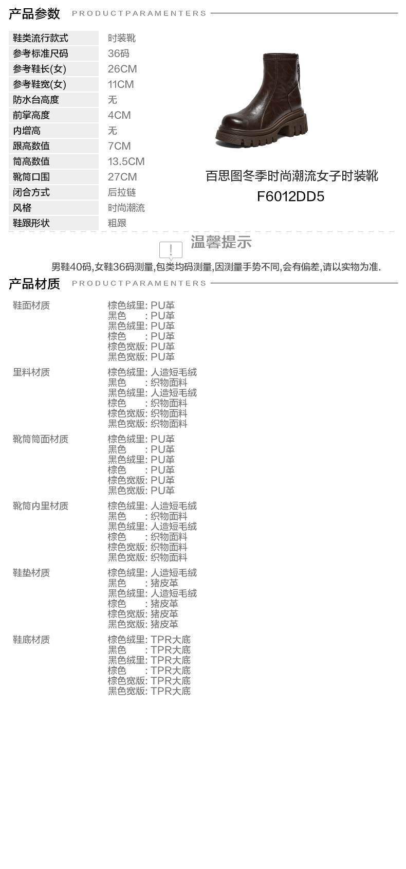 | 参考鞋宽(女):11CM | 风格:时尚潮流 | 色系:棕色 | 跟高数值:7CM | 筒高数值:13.5CM |