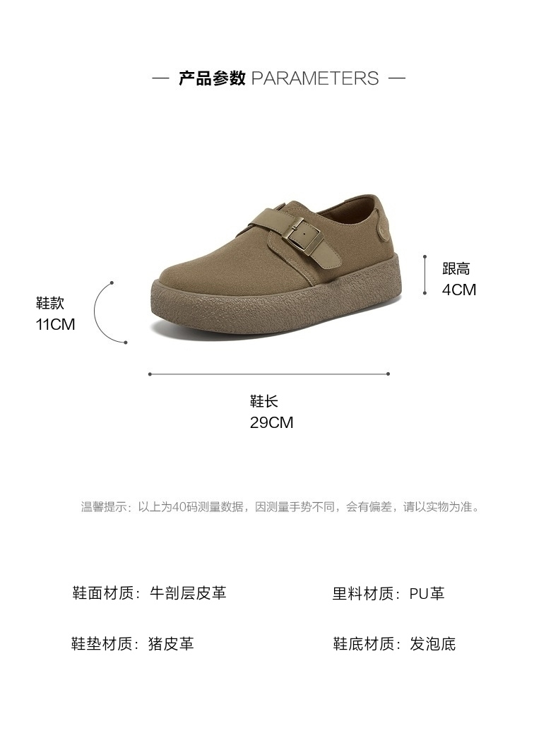 | 内增高:无 | 鞋跟形状:厚底 | 鞋面材质:牛剖层皮革 | 流行元素:纯色 | 闭合方式:套脚 |