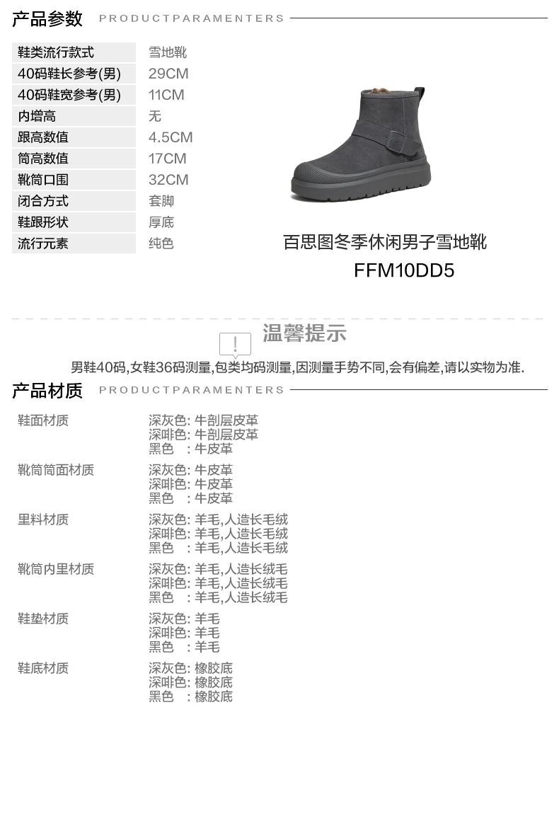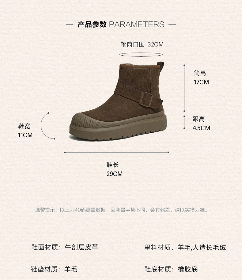 | 40码鞋长参考(男):29CM | 鞋底材质:橡胶底 | 靴筒内里材质:羊毛人造长绒毛 | 内增高:无 | 鞋面材质:牛剖层皮革 |