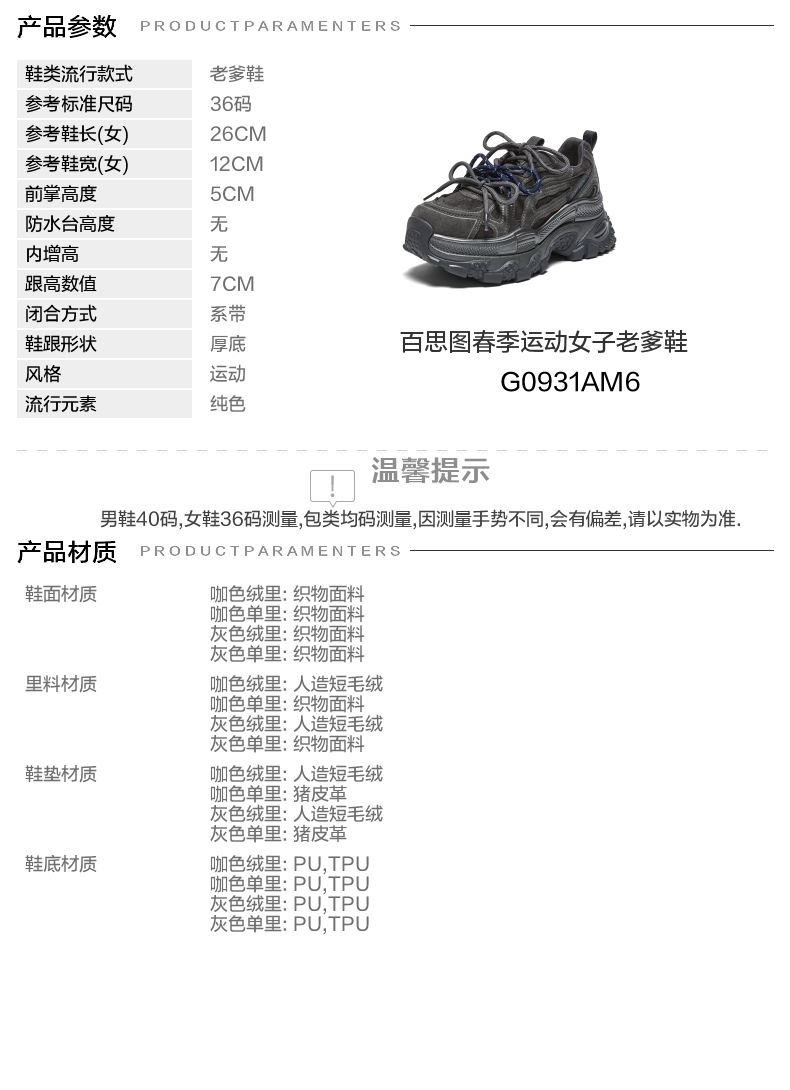 | 鞋跟形状:厚底 | 参考鞋长(女):26CM | 流行元素:纯色 | 参考鞋宽(女):12CM | 风格:运动 |