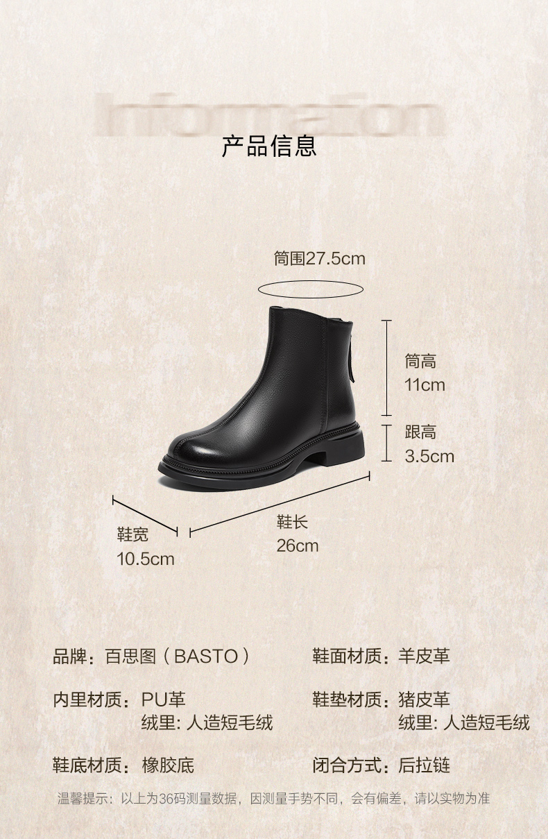 | 跟高数值:3.5CM | 筒高数值:11CM | 性别:女子 | 靴筒筒面材质:羊皮革 | 里料材质:PU革 |