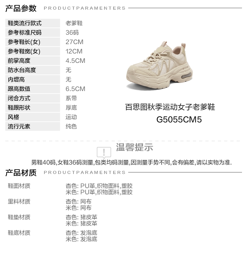| 鞋垫材质:猪皮革 | 前掌高度:4.5CM | 皮质特征:无 | 鞋类流行款式:老爹鞋 |