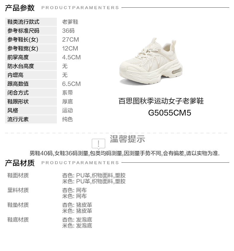| 鞋垫材质:猪皮革 | 前掌高度:4.5CM | 皮质特征:无 | 鞋类流行款式:老爹鞋 |