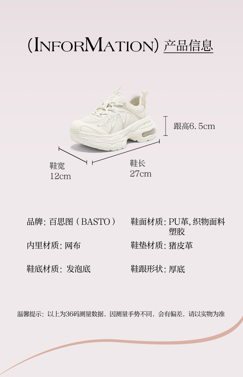 BASTO(百思图),品牌拥有17年历史,秉承优雅、甜美、清新的设计理念,主张“好嫁风”的产品风格,将甜美俏丽的少女情怀融合优雅气质的时尚品味,塑造出唯美优雅、受欢迎的女鞋款式。主打以女性温柔与亲和力为特色的流行时尚产品,糅合雅致又富有亲和力的裸粉色调,淑媛端庄、清新甜美。目前品牌已开设线下门店达1400多家。