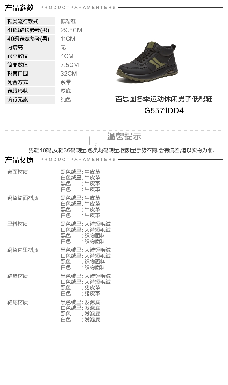 | 闭合方式:系带 | 40码鞋宽参考(男):11CM | 靴筒口围:32CM | 上市时间:2024年冬季 | 鞋类流行款式:低帮鞋 |