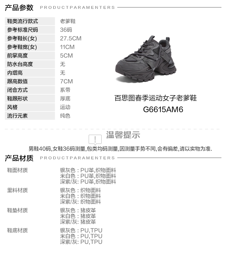 | 鞋跟形状:厚底 | 参考鞋长(女):27.5CM | 流行元素:纯色 | 参考鞋宽(女):11CM | 风格:运动 |
