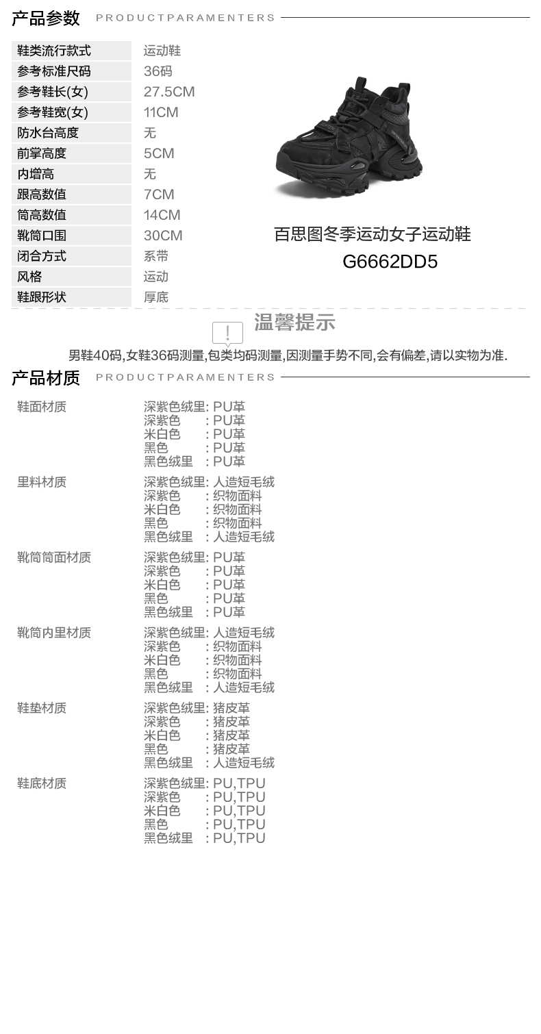 | 参考鞋宽(女):11CM | 风格:运动 | 色系:黑色 | 跟高数值:7CM | 筒高数值:14CM |