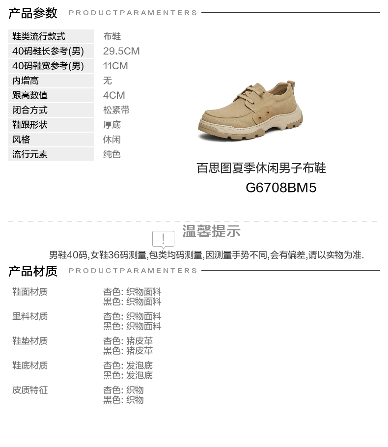 | 跟高数值:4CM | 性别:男子 | 里料材质:织物面料 | 内里:纺织品 | 制鞋工艺:车线胶粘 |