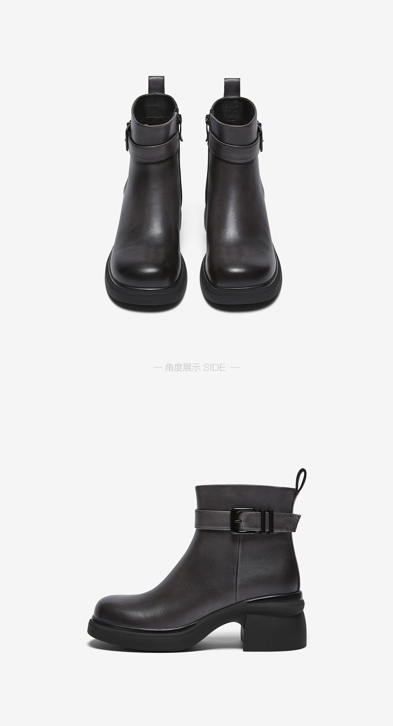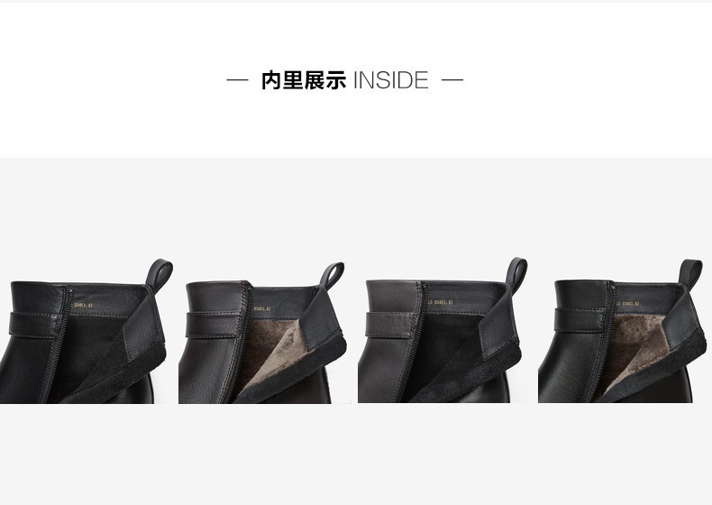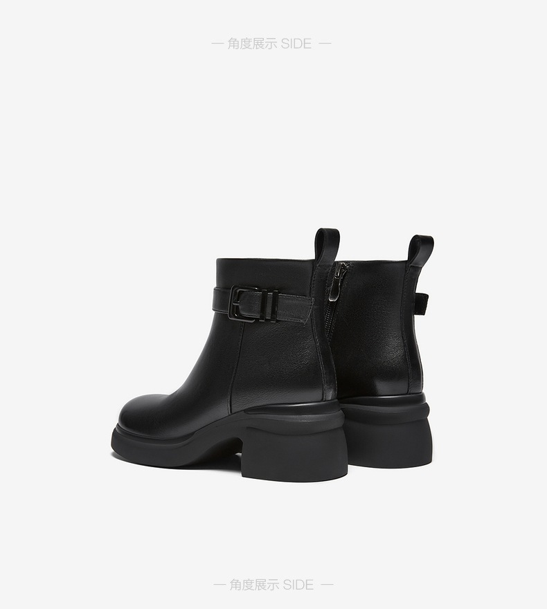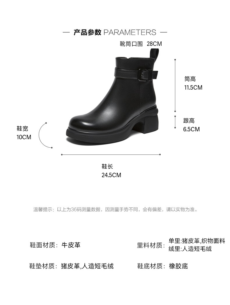 | 鞋底材质:橡胶底 | 靴筒内里材质:织物面料猪皮革 | 内增高:无 | 鞋面材质:牛皮革 | 闭合方式:侧拉链 |