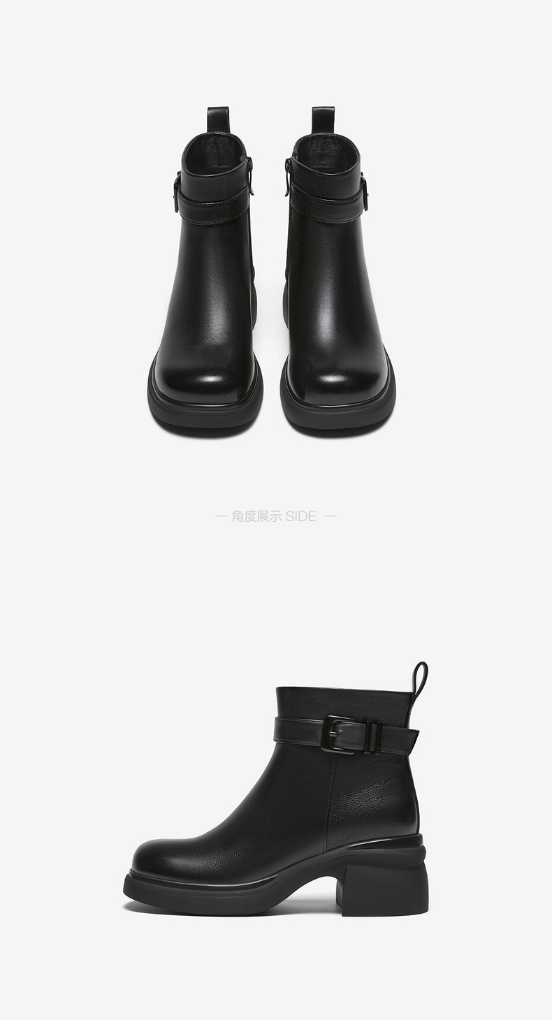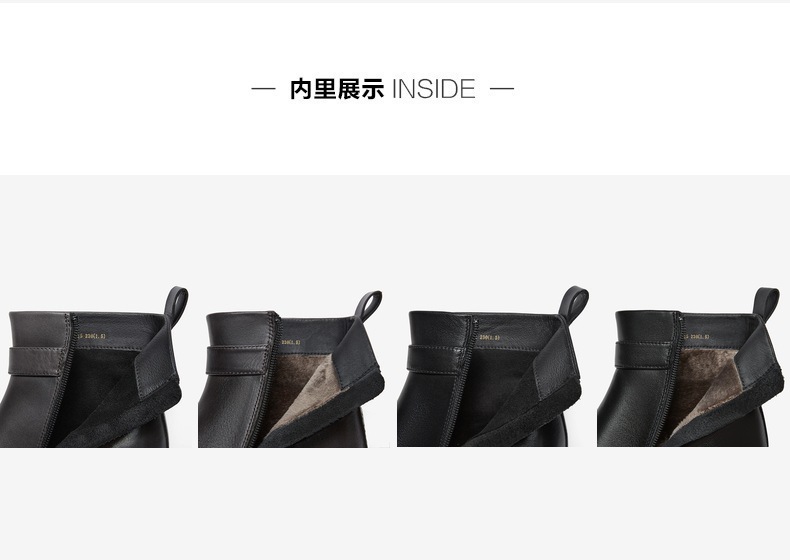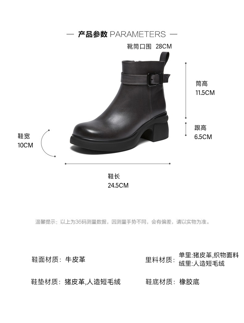 | 鞋底材质:橡胶底 | 靴筒内里材质:人造短毛绒 | 内增高:无 | 鞋面材质:牛皮革 | 闭合方式:侧拉链 |