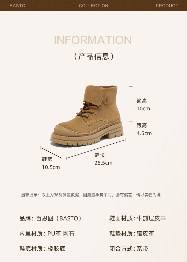 | 参考鞋宽(女):10.5CM | 风格:时尚休闲 | 色系:棕色 | 跟高数值:4.5CM | 筒高数值:10CM |