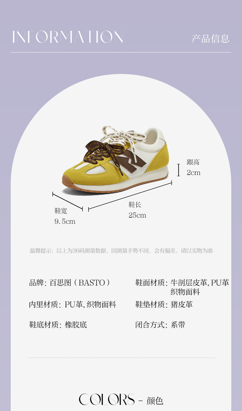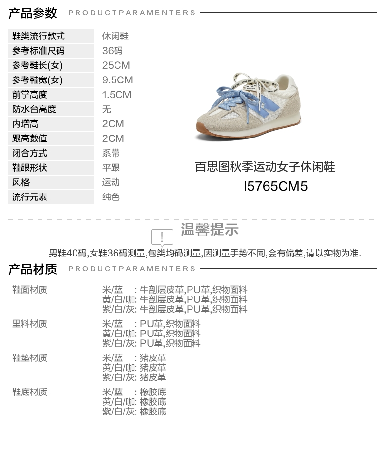 | 鞋帮:低帮 | 鞋底材质:橡胶底 | 内增高:2CM | 鞋面材质:PU革牛剖层皮革织物面料 | 闭合方式:系带 |