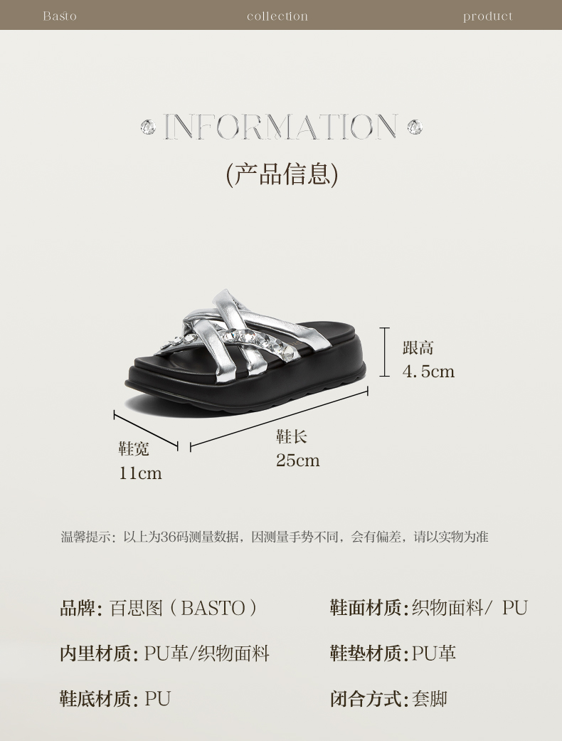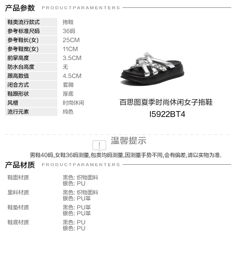 | 鞋类流行款式:拖鞋 | 鞋头款式:露趾 | 执行标准:拖鞋 QB/T 4552-2020 | 跟高范围:中跟鞋(3-5CM) | 鞋面图案:纯色 |