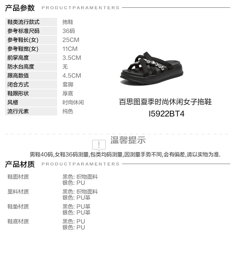 | 鞋类流行款式:拖鞋 | 鞋头款式:露趾 | 执行标准:拖鞋 QB/T 4552-2020 | 跟高范围:中跟鞋(3-5CM) | 鞋面图案:纯色 |