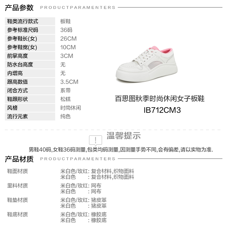 | 色系:白色 | 跟高数值:3.5CM | 性别:女子 | 里料材质:网布 | 制鞋工艺:胶贴皮鞋 |