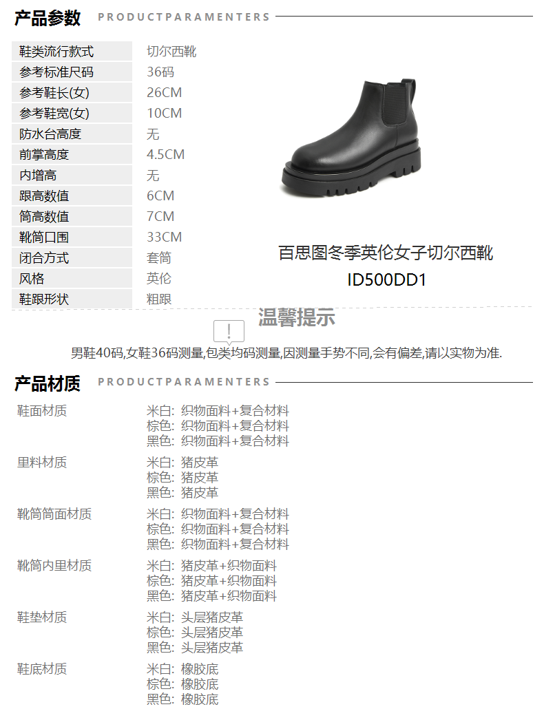 | 配跟:无 | 靴筒口围:33CM | 上市时间:2021年冬季 | 鞋类流行款式:切尔西靴 | 鞋头款式:圆头 |