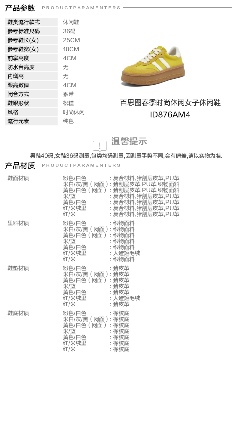 | 色系:黄色 | 跟高数值:4CM | 性别:女子 | 里料材质:织物面料 | 制鞋工艺:胶贴皮鞋 |