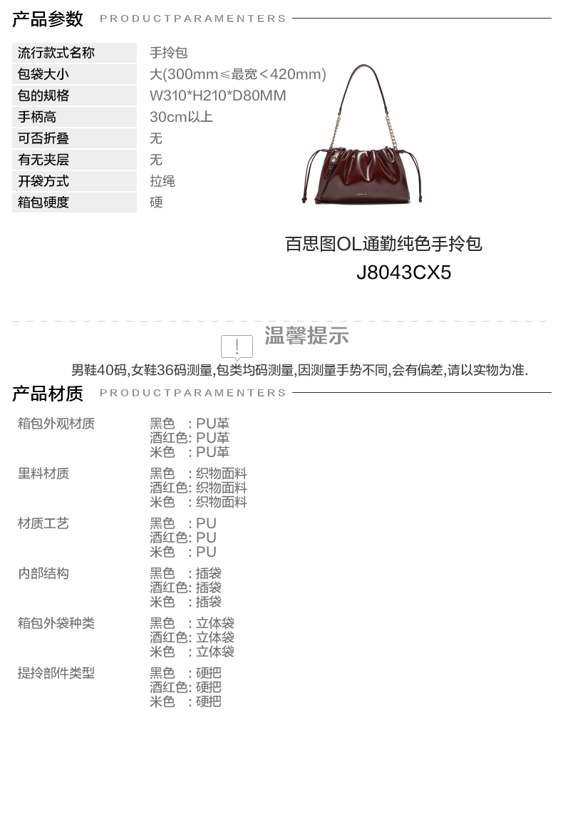 | 肩带样式:1根 | 手柄:有 | 提拎部件类型:硬把 | 流行元素:纯色 | 包的规格:W310*H210*D80MM |
