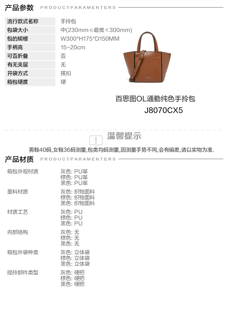| 肩带样式:1根 | 手柄:有 | 提拎部件类型:硬把 | 流行元素:纯色 | 可否折叠:否 |
